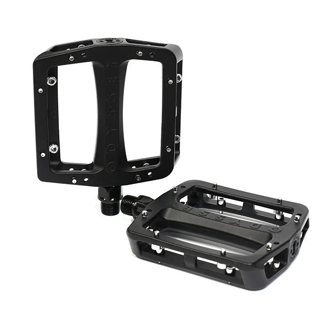 Odyssey BMX come through with another killer product, the Odyssey Grandstand pedals. Tom Dugan wanted a big platform BMX pedal with a slim profile and these pedals from Odyssey BMX delivers. The alloy version is tough, with removable pins for custom traction and a longer life.
